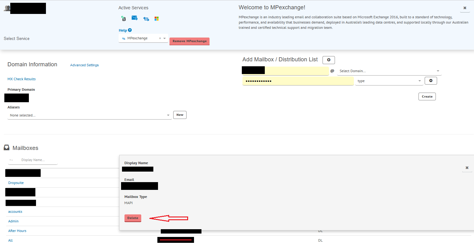 Deleting a mailbox from the MPexchange hosted exchange service, either from Converge or from the MPexchange portal.