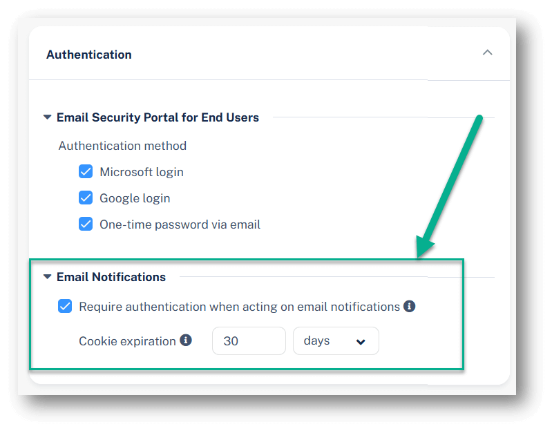 - Whether or not users need to authenticate when clicking on links from email notifications (such as restoring an email from quarantine)