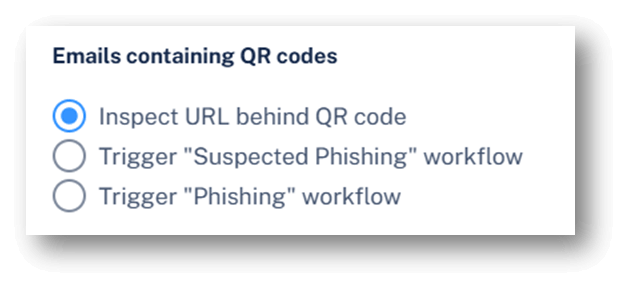 - To do that, go to Security Settings > Security Engines > Anti Phishing > Configure > Emails containing QR codes and select between the default option (inspect URL behind QR code) and the Phishing/Suspected Phishing workflows.
