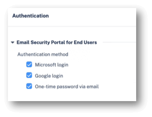- To authenticate to the End User Portal, end users can either enter their email address and receive a one-time passcode, or, alternatively, login via Microsoft / Google.