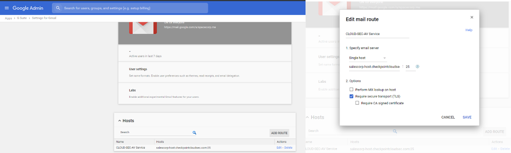Avanan automatically creates a host (aka mail route) in your Google Admin console. You can see the host from the Google Admin Console under Apps > G Suite > Settings for Gmail > Hosts.