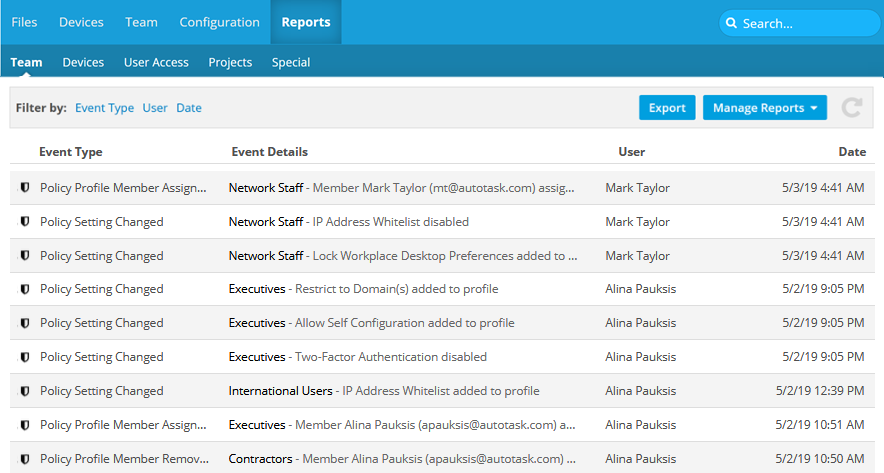 The Reports tab allows administrators to report on users, projects, devices, and activity within Workplace, and to export reports. Team, device, user access, and project reports have slightly different filters available, but they all work the same way.
