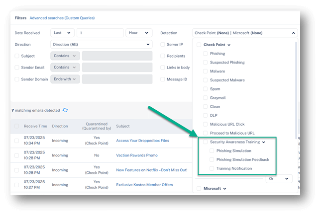 With the updated Quarantine State filter, you can now exclude emails that were already released when searching for quarantined messages - whether they were quarantined by Check Point or Microsoft. This helps reduce clutter and focus investigations on unresolved cases. Additionally, a new Detection filter lets you search for emails generated by Avanan's Security Awareness Training, including phishing simulations, feedback messages, and training notifications - making it easier to track campaign engagement and impact.