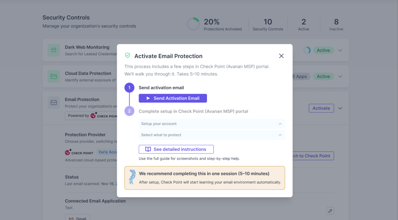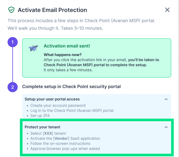 If activation fails or redirects to the Avanan login page, confirm using one of these browsers. Other browsers (like Firefox, Safari, or Brave) may block session cookies and cause the activation to fail. - Partners using MPmail may experience issues when activating Check Point email protection within Guardz. Please contact Support before activating.