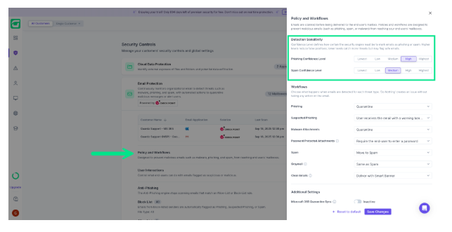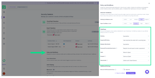 Admins can change the defined workflows (according to pre-defined drop down lists) applied to emails that match each threat type. The recommended option per each workflow is marked with a star symbol. The workflows are: