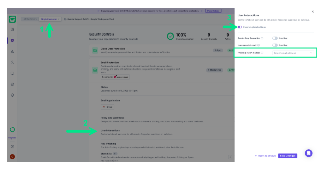 Define a mailbox where users can send suspicious emails. Admin must enter the address, and this address must also belong to an active Guardz user (this feature is available in single customer mode only, and make sure to toggle on the 'Override' function).