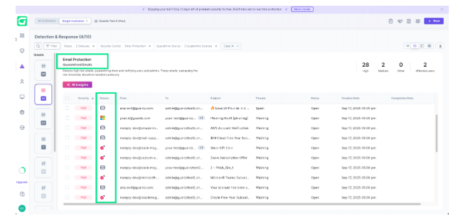 - The ‘Source’ column represents the source of the detection: Check Point, Microsoft Quarantine or Guardz
