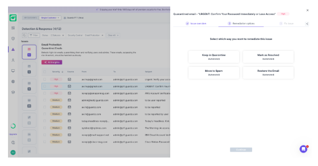 - Admins can proceed and take a remediation action according to the suggested options (i.e., Keep in Quarantine, Move to Spam, Restore Email, etc.)