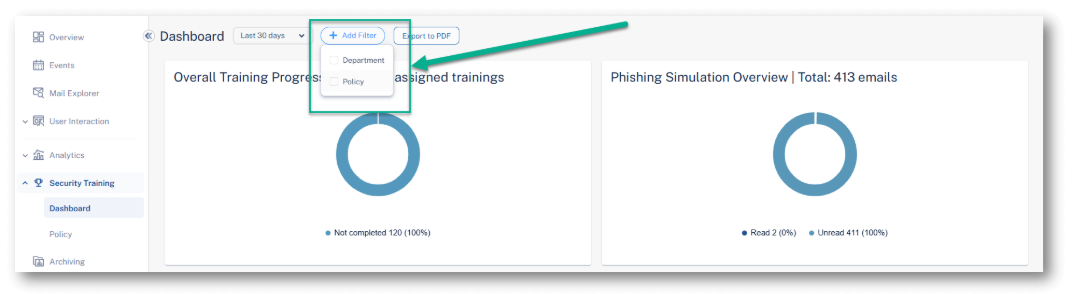 - Granular reporting and insights: The SAT dashboard now allows filtering by department and policy, enabling administrators to easily review training engagement and phishing simulation results for specific teams or high-risk business units.